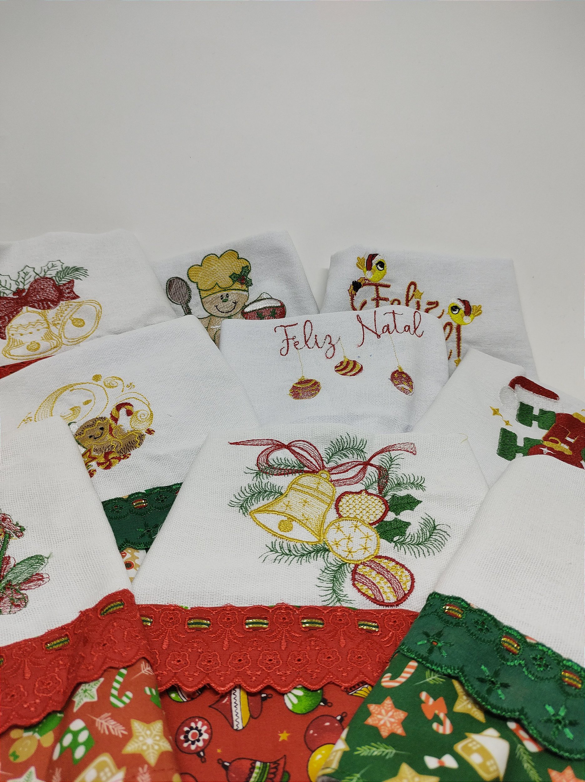 Pano de prato de tecido alvejado branco com barrado em tecido tricoline 100% algodão bordados com motivos natalinos e detalhes com passa-fita e fita de cetim.
